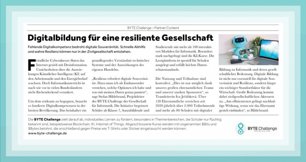 Wir freuen uns sehr: BYTE ist heute im Handelsblatt in der Beilage zu Resilienz und KI vertreten. Damit wird ein Thema sichtbar, das uns von Anfang an antreibt: Digitale Bildung ist keine Kür, sondern eine Voraussetzung dafür, dass Menschen in einer digitalen Welt selbstbestimmt und widerstandsfähig handeln können.